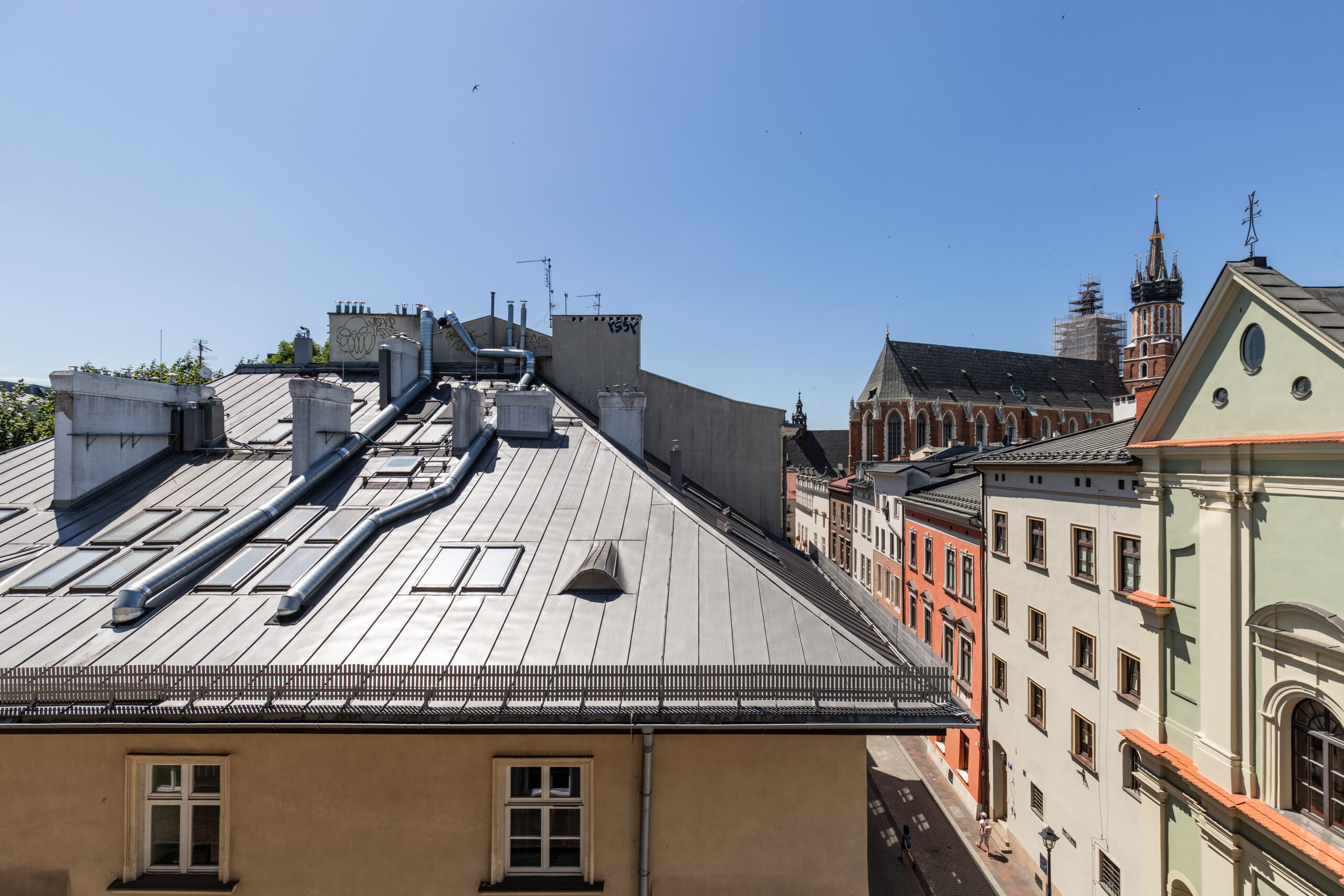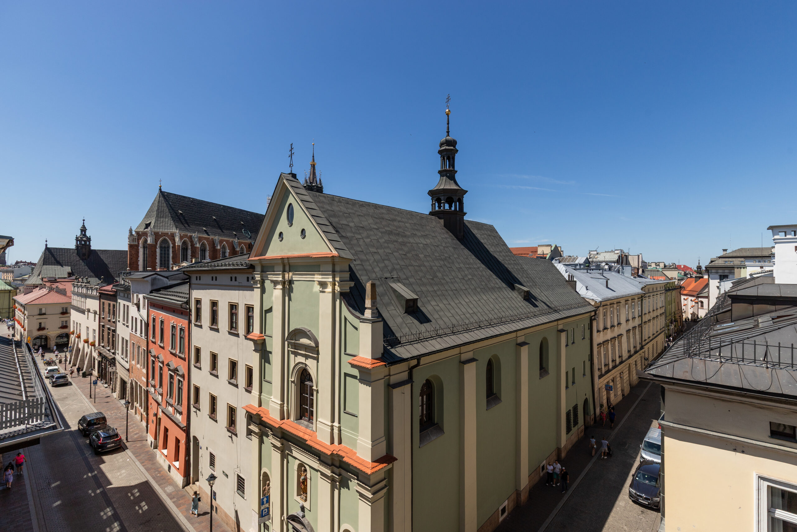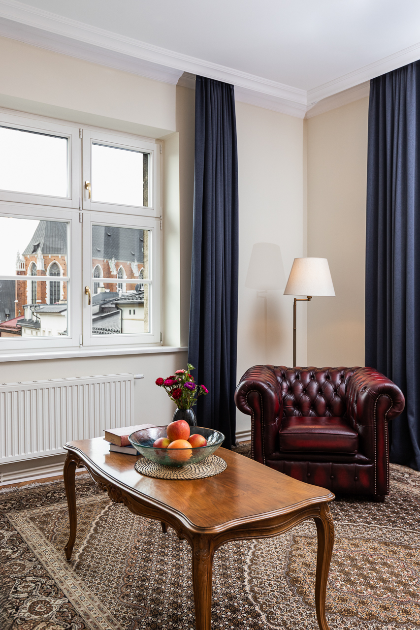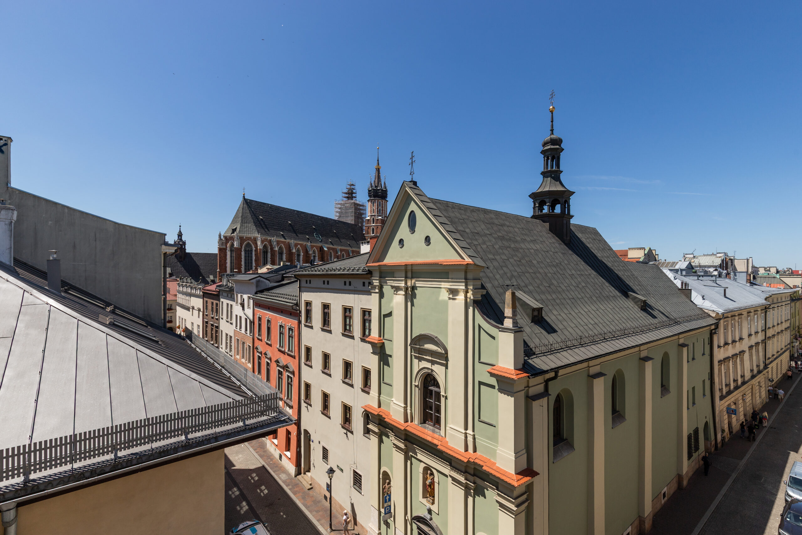 Large windows offer unobstructed views of St. Mary’s Basilica — one of Kraków’s most iconic landmarks.