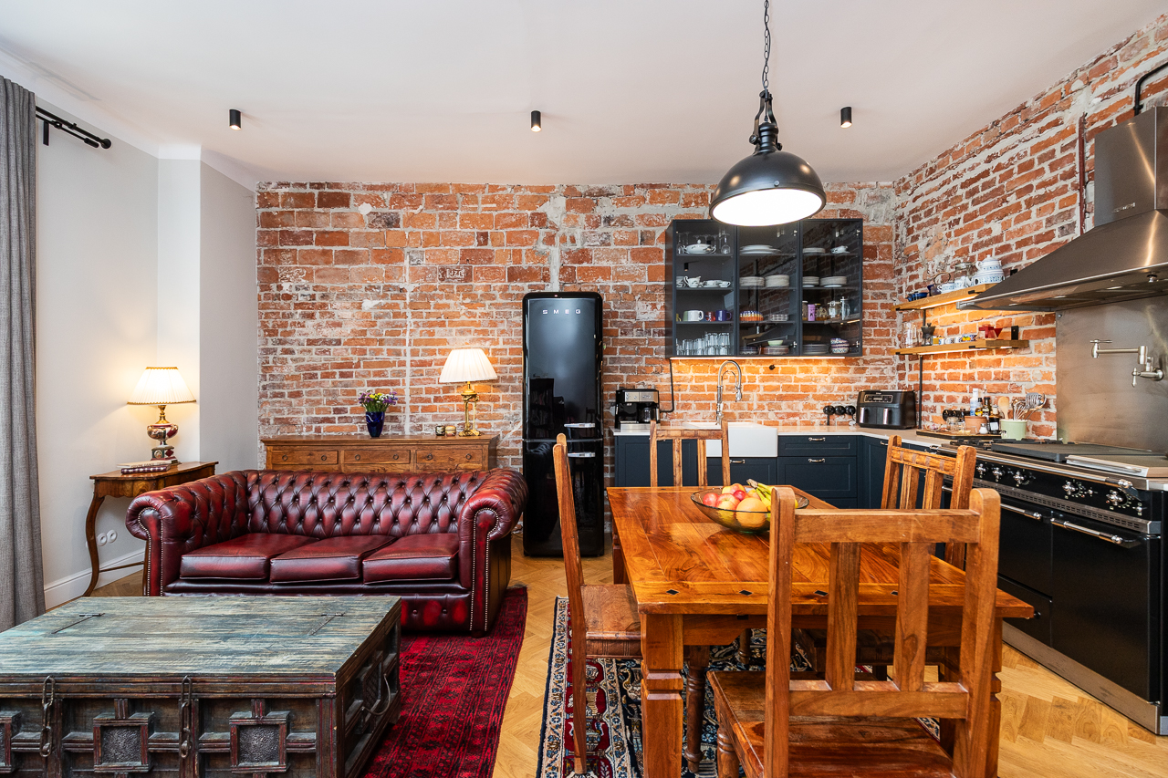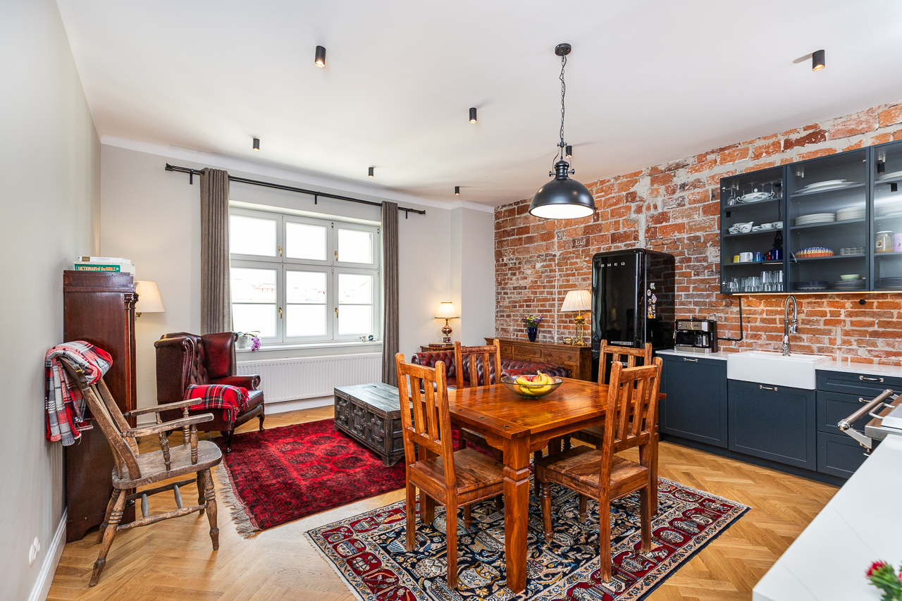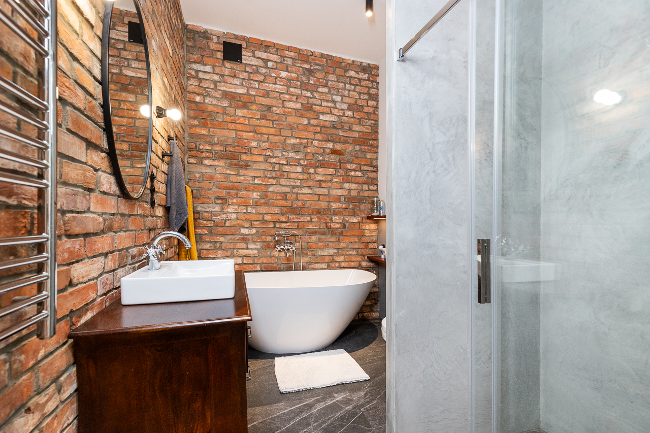 The second unit presents a contemporary character with exposed brick walls, two bedrooms, two bathrooms and an open kitchen living area overlooking the rooftops of Kraków’s Old Town.