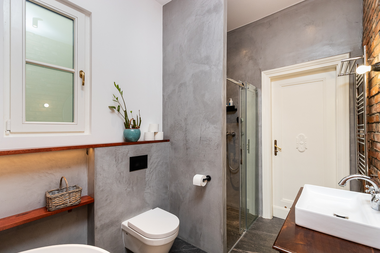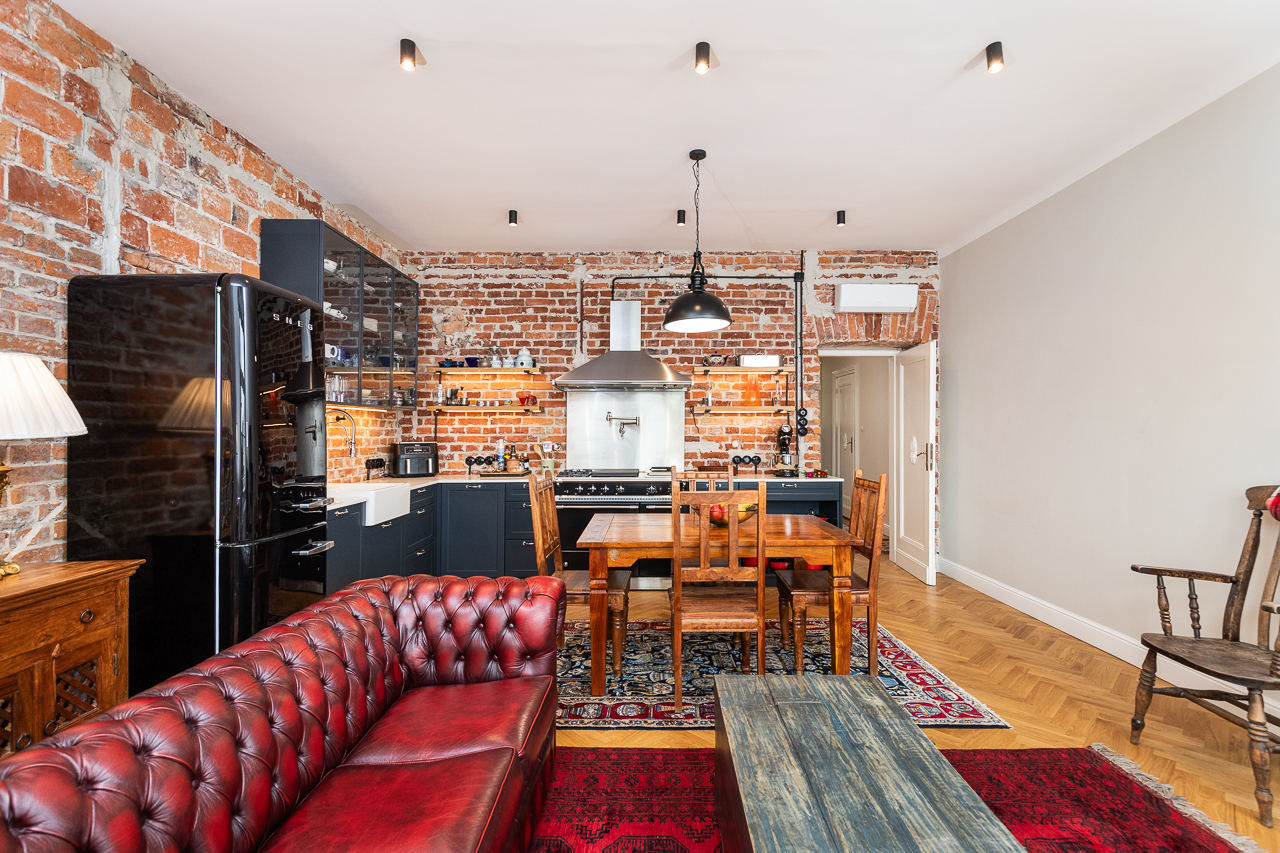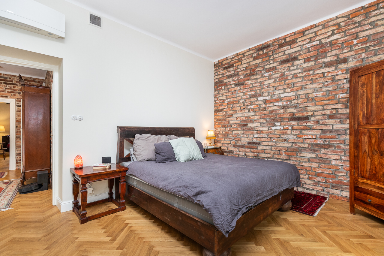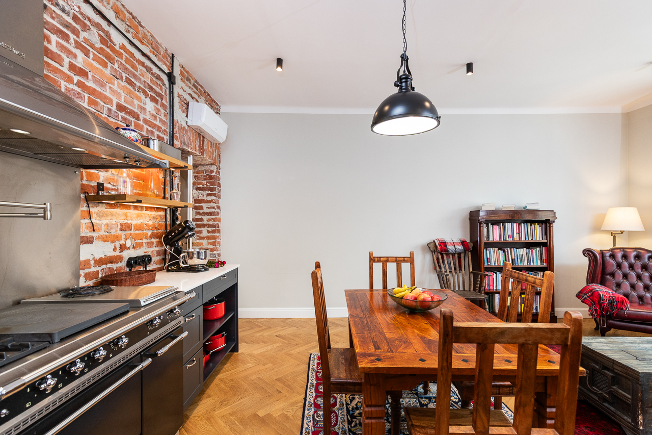 The second unit presents a contemporary character with exposed brick walls, two bedrooms, two bathrooms and an open kitchen living area overlooking the rooftops of Kraków’s Old Town.