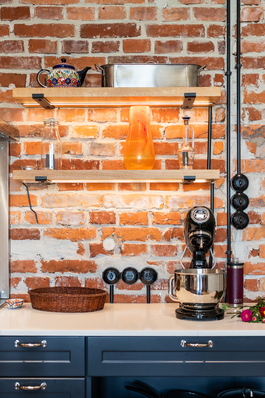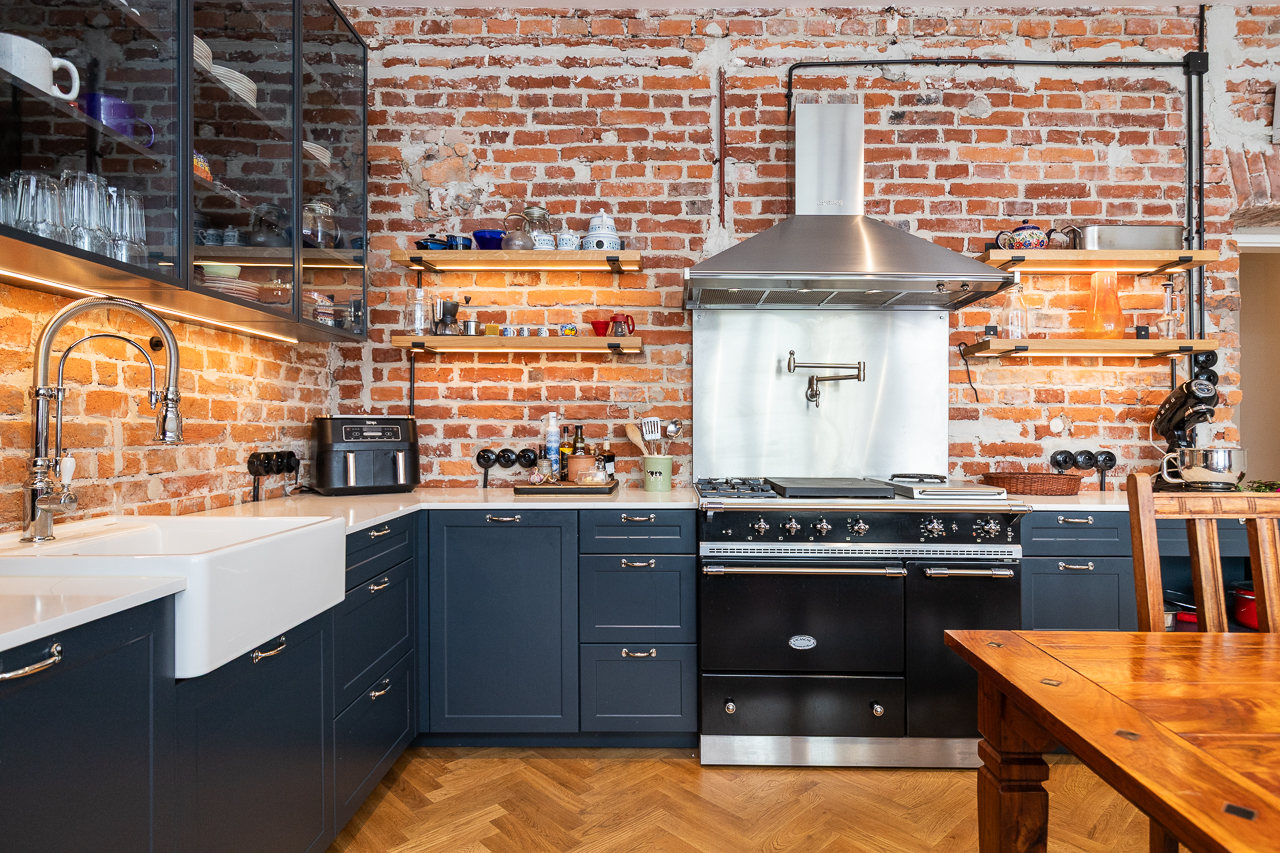 The second part of the residence introduces a contemporary atmosphere with exposed brick walls and subtle industrial design.