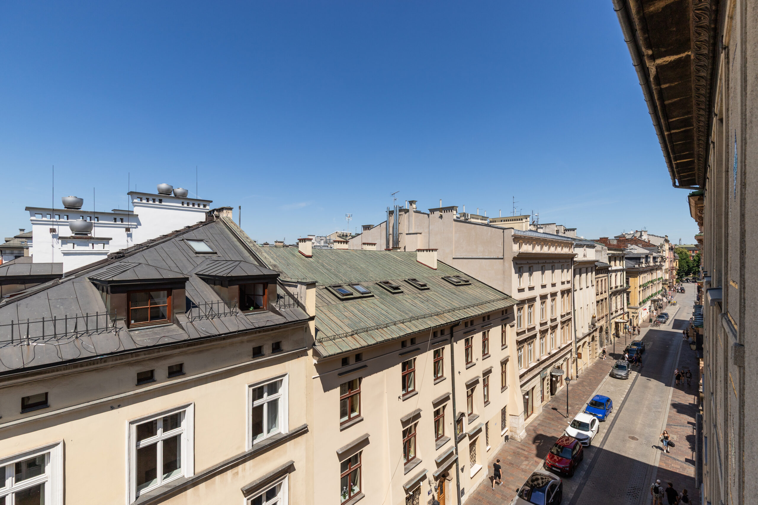 The apartment enjoys views towards St. Mary’s Basilica, one of Kraków’s most recognizable landmarks, famous for the traditional trumpet call played every hour from its tower.