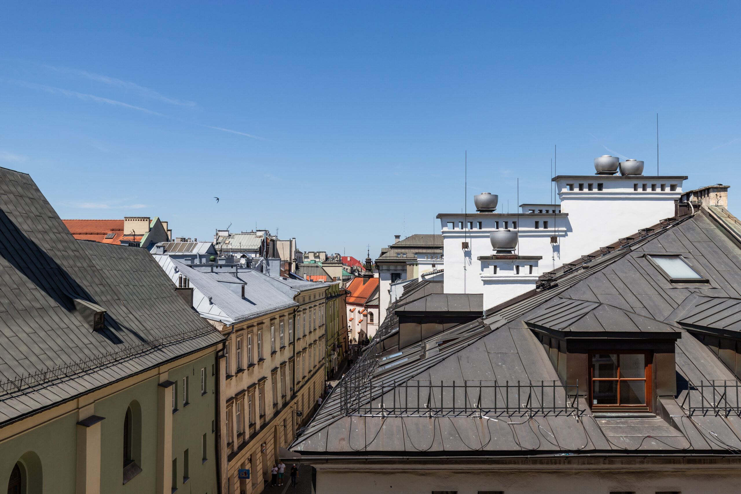 This unit includes two bedrooms, two bathrooms and a living room with an open kitchen overlooking the rooftops of Kraków’s Old Town.